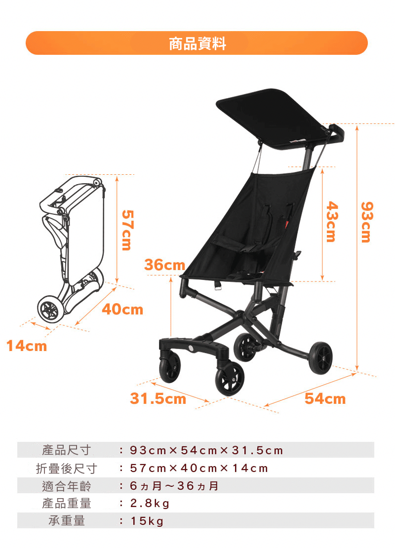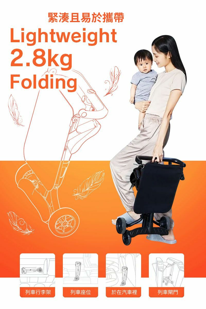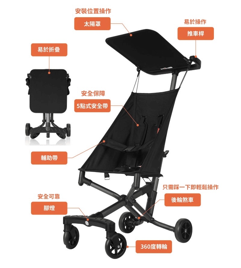 The Portable Pushchair is designed for parents who like on-the-go. Its compact frame folds into a space-saving package that can fit in overhead compartments, under train seats orin car trunks. Designed with a stylish aluminium frame, the lightweight pushchair weighs only 2.8kgs, it is portable enough to take practically anywhere. Lightweight stroller makes any outing a little easier. Also it has linked-brake, adjustable sunshade, and 5-point harness for your love ones safety.